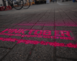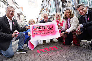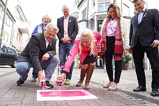 Gesundheitsministerin Diana Stolz setzt mit einem Graffiti in der Fußgängerzone von Heppenheim ein pinkes Zeichen gegen Krebs und für Vorsorgeuntersuchungen Credits: Thomas Zelinger